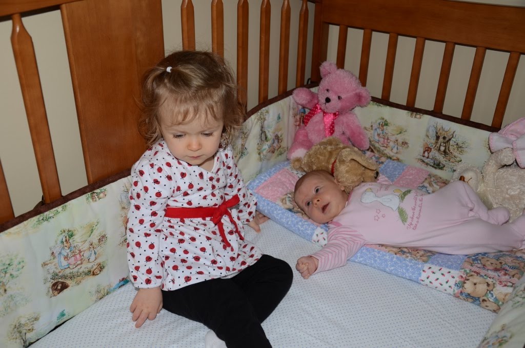 Getting Hope up from her nap generally entails folding all the blankets and leaving her bed neat and tidy. Needing two hands for that job, I usually plop Joy in the crib with Hope while I straiten things.
