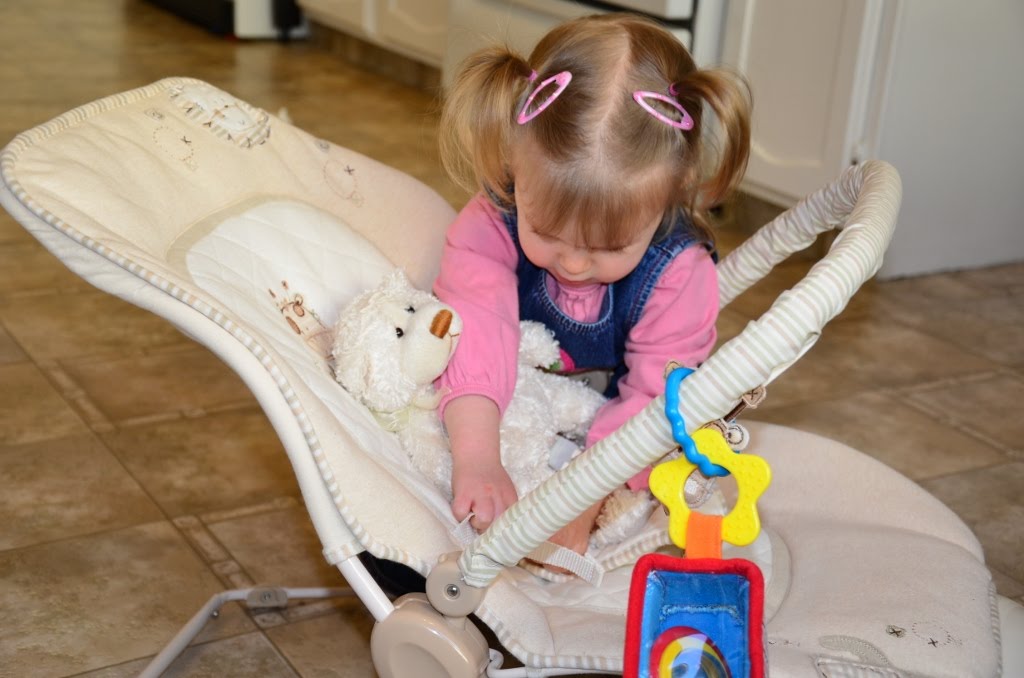 Then she decided that since Joy wasn't in the bouncer that her bear should be in it.