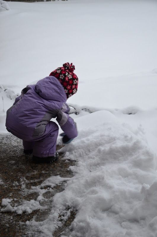 And then we got more snow. So out went Granny and Hope again, this time with shovels (which Granny was getting while Hope started brushing snow off the step with her hand.)